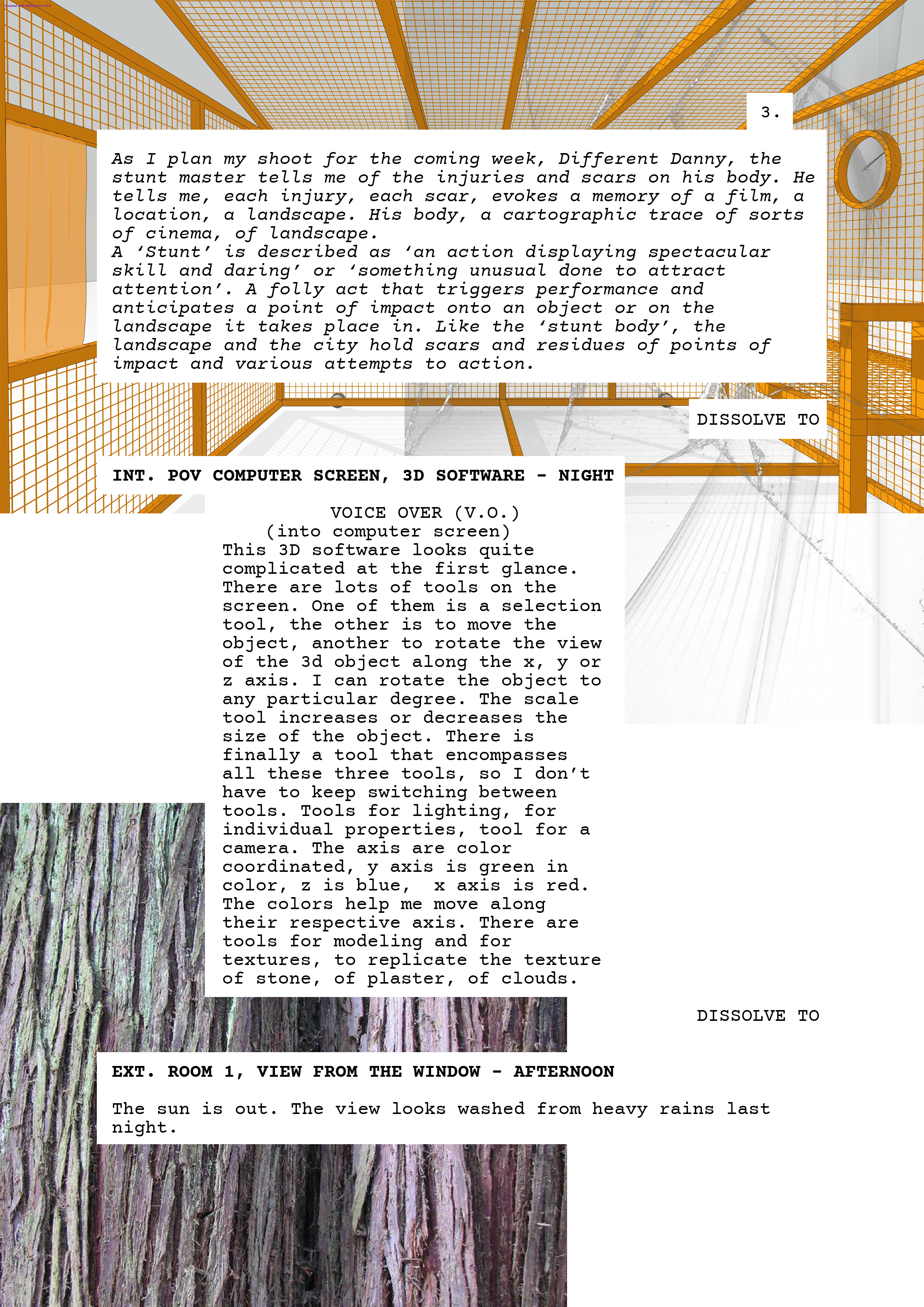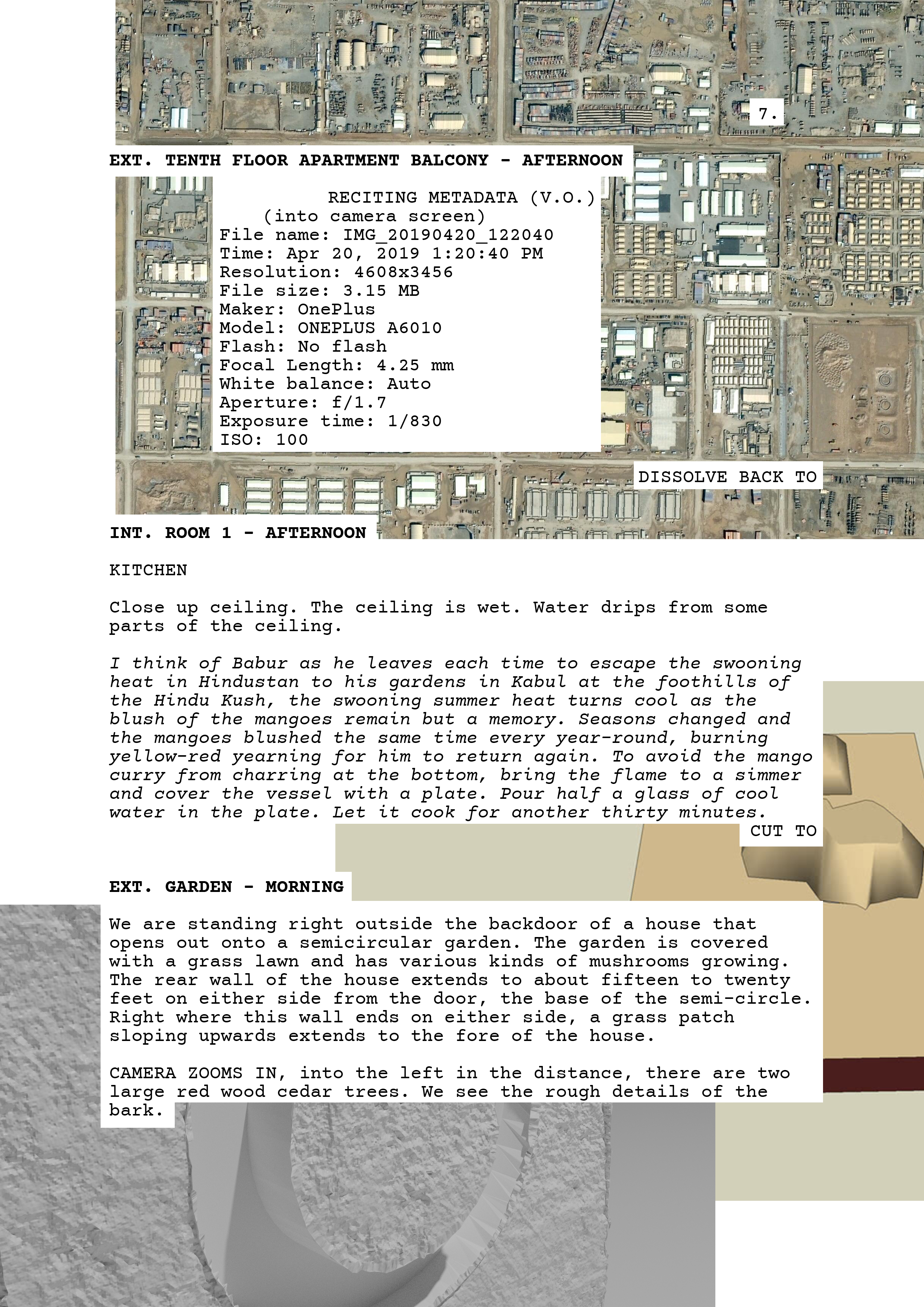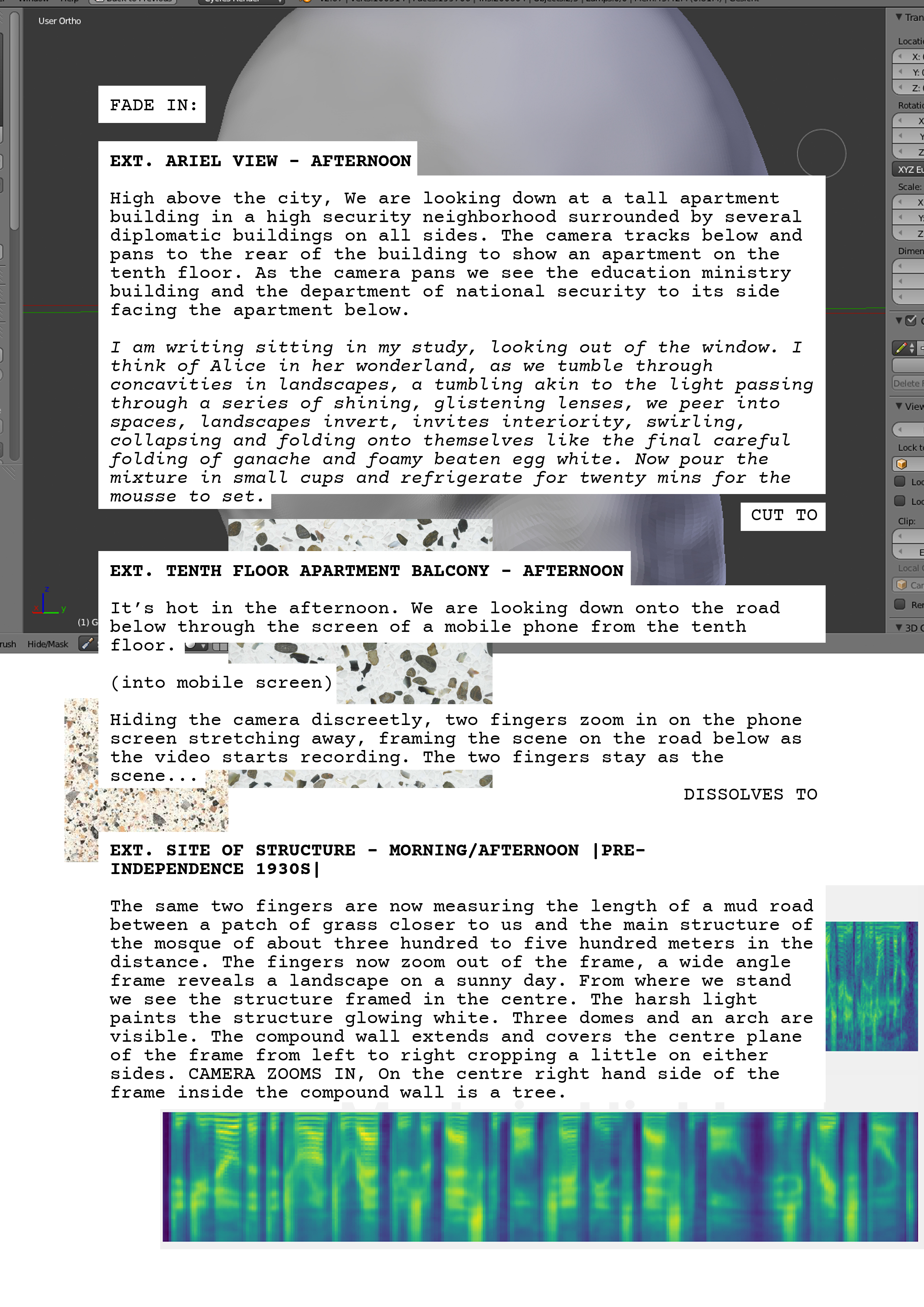 Brief Description - A digital collaboration brings together artists Arshi Irshad Ahmadzai, Sanket Jadia, Manjot Kaur, Salik Ansari, and Tonoy Sharma, on the invitation of Amshu Chukki, in partnership with Avid Learning, to forge an experimental screenplay that challenges conventional narrative boundaries. The work assembles a mosaic of disparate fragments—ranging from archival imagery of the demolished Babri Masjid, a voyeuristic view from a Kabul balcony, digitally rendered environments, and the intimate mise en scène of an artist’s friend’s studio, to raw camera log data, meticulous garden measurements, and reflective lockdown diary entries.