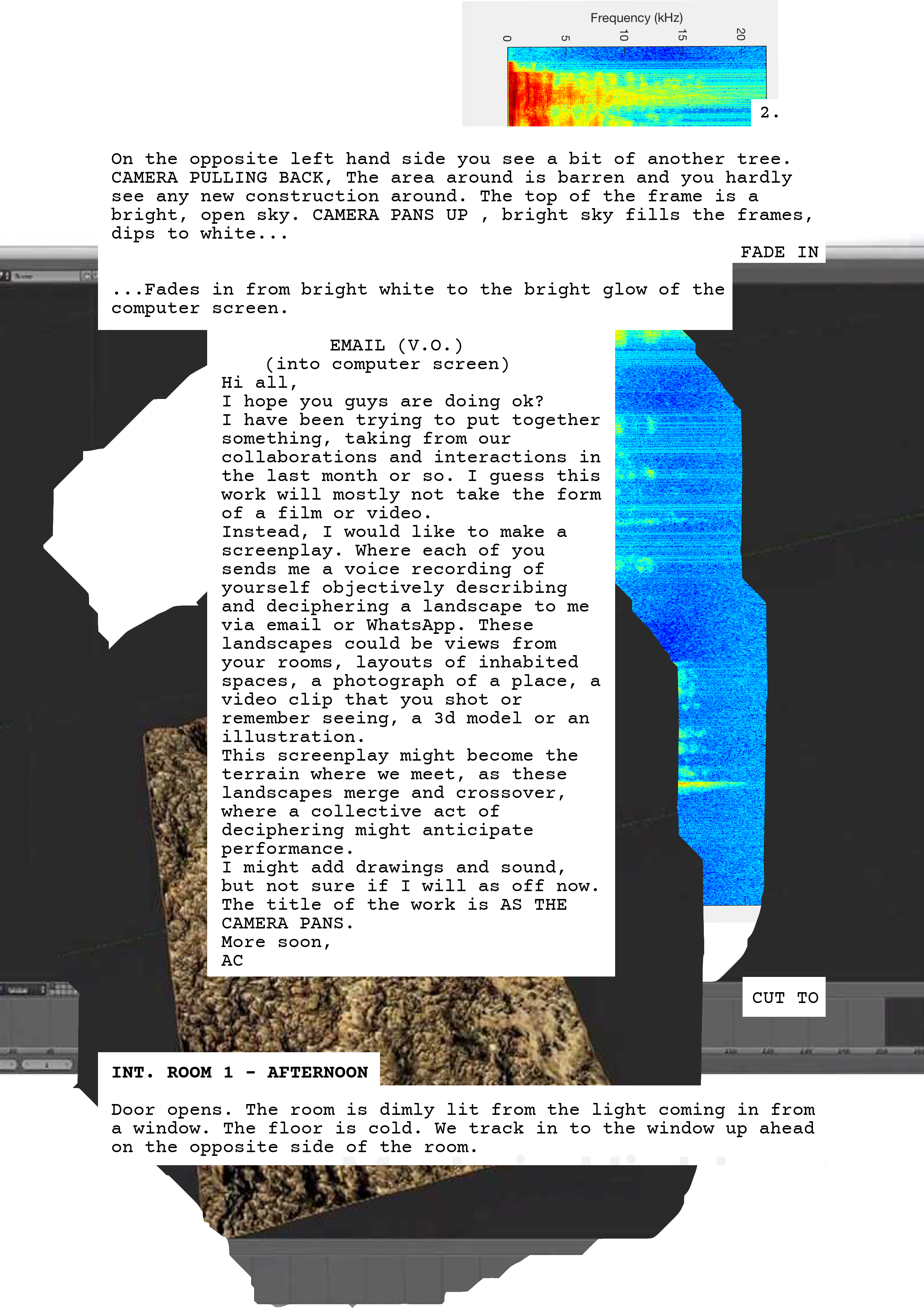 In this re-envisioned narrative, diverse landscapes—both real and imagined—interweave through layers of recollection and speculative retelling. Each contribution serves as a discrete vignette, yet together they evoke a fluid, poetic terrain where memory, perception, and desire coalesce. Emerging from the isolation of 2020, the screenplay unfolds as a dynamic exploration of spatial and temporal dimensions—a living document that captures the ephemeral quality of experience and possibilities of collaboration .