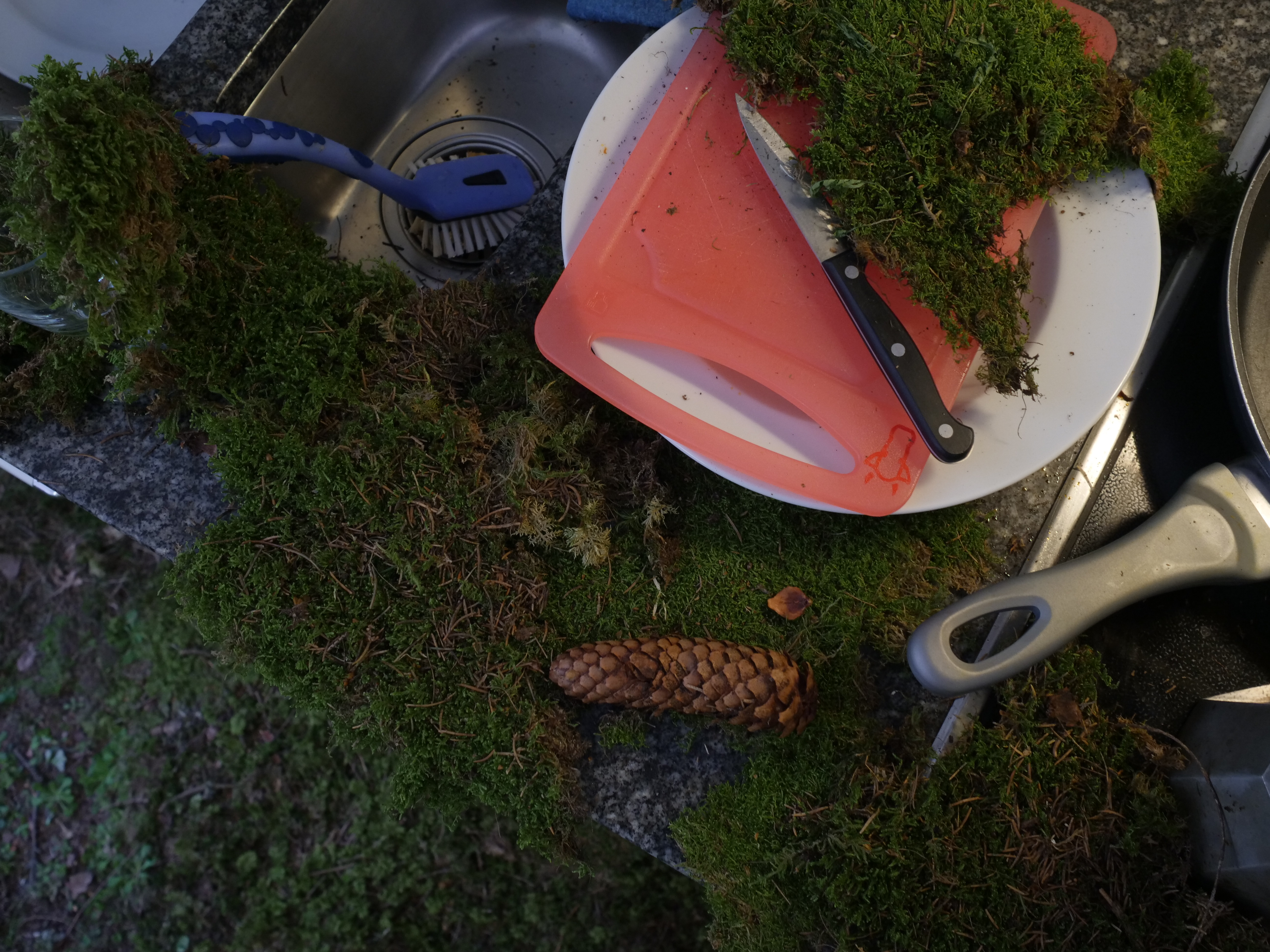 The dinner party proposes a scene of futurity, a site of incident or perhaps a scene of crime left undone. A kitchen left still and out of utility. Claimed by the overreaches of nature, green foliage covers everything left behind by her guests – a loaf of bread, dirty dishes and appliances -like they left moments ago, abruptly, brusquely.